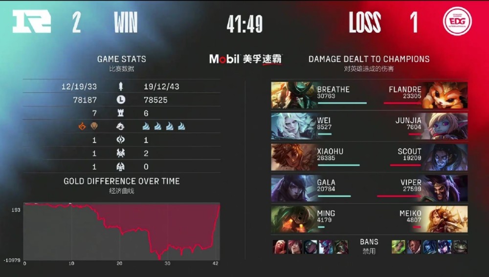 在前两局互相暴打打平之后,决胜局双方展开了一场40多分钟的鏖战,EDG在经济领先多达1万以上的情况下,悲剧再次上演,连续几波推进出现失误,Junjia手握惩戒被船长大招抢下大龙,从天堂到地狱,被RNG一波远古龙直接翻盘。
