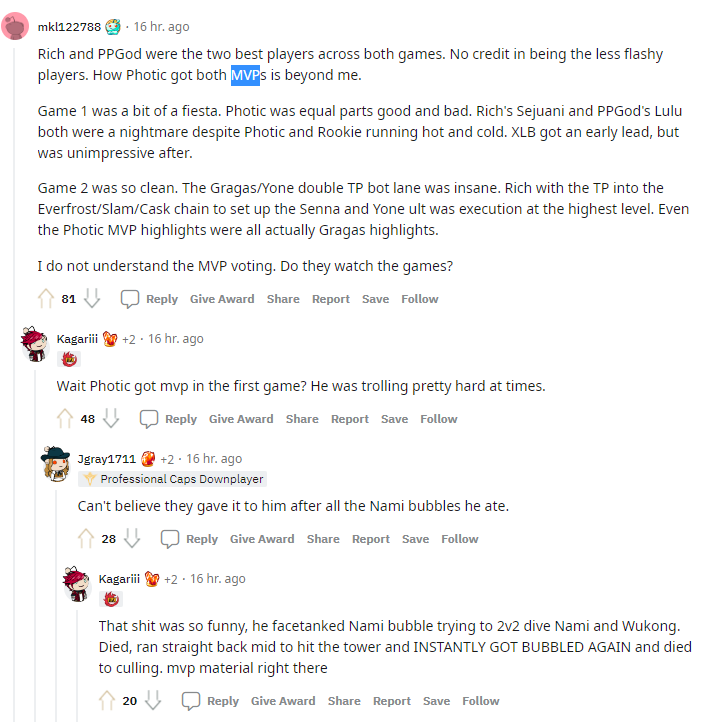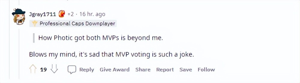 在22号V5对LNG的比赛结束后,因为两场比赛的MVP全部给了photic,这也引发了海外网友的一阵骚动,不少网友都觉得LPL如今的投票就是个笑话,因为这些解说或者参与投票的人根本没搞清楚谁才是这场比赛的关键先生。