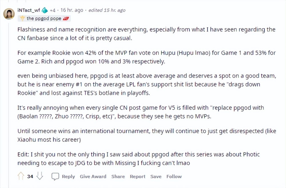 即使在这里不偏不倚,ppgod至少高于平均水平,值得在一个好的团队中占有一席之地,但他在普通LPL粉丝的支持名单上几乎是众矢之的,因为他 "拖累了Rookie",在季后赛中输给了TES的下路