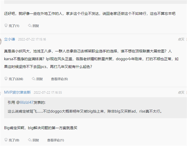 有人表示理解doggo的想法:首先,他留在LDL还有机会回来LPL。其次,doggo的游戏实力已经成长了,回到PCS只会碾压其他ad,很没意思。最重要的一点是,在LPL可以拿到比较高的年薪,热度也高,回PCS就没有这种条件了。