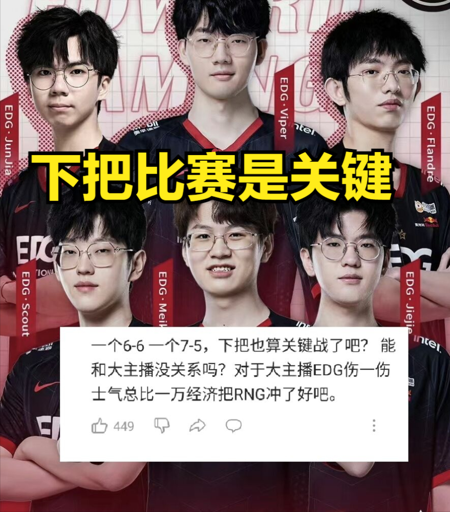 DOINB在说完自己高兴的原因之后,也是在直播当中祈祷EDG在跟RNG战队打完比赛之后心态出现问题,因为EDG战队接下来要打LNG战队,如果LNG战队在比赛当中击败EDG,那么LNG战队就能稳定进入前6。(LNG和EDG如今的成绩差不多,LNG是6/6,而edg是7/5,下把比赛,就是双方的焦点对战了)