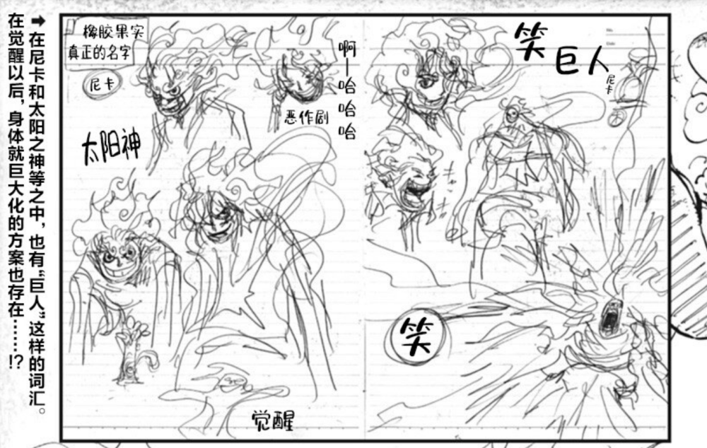 此外,设定图中还有关于“巨人”的信息,路飞与凯多的大战中曾有过变成“巨人”的场景,当路飞变成巨人时,就连化身成龙形态的凯多都顷刻之间变成“蝼蚁”,很多海米至今仍没有忘记当时“巨人”路飞留下的深刻印象。看来尾田早已将“巨人化”的设定放在五档路飞的身上。