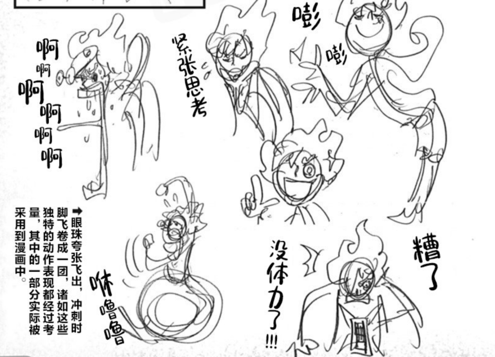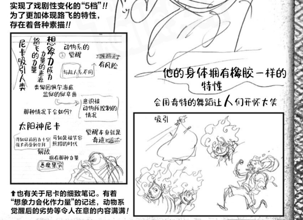 除了一些能力上的设定外,尾田的草稿图还有很多有趣的信息。譬如五档路飞露出惊讶表情的状态,或者是没有体力的“电量提醒”,这些都是五档路飞的专属设定,尾田为了让五档路飞变成最有趣的人,也算是高度借鉴了《猫和老鼠》的经典画面了。