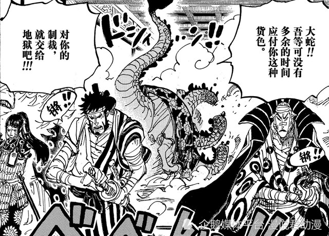 黑炭大蛇是个欺软怕硬的怂货,以为被凯多修理的赤鞘武士没多少实力,但他也不看看自己有多废。以赤鞘武士的实力。对付黑炭大蛇根本就不费力。虽说动画组原创了每个人斩杀大蛇的特写,但没有再现漫画中的大场景,有点遗憾。