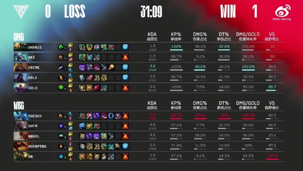 比赛结束后,必须和大家分享一下The Shy的个人数据,可以看到The Shy在六项数据中,五个都排名第一,KDA,参团率,伤害占比,承伤占比和伤害转换率全部排名第一,唯一一个无法拿到第一的数据就是视野得分了。