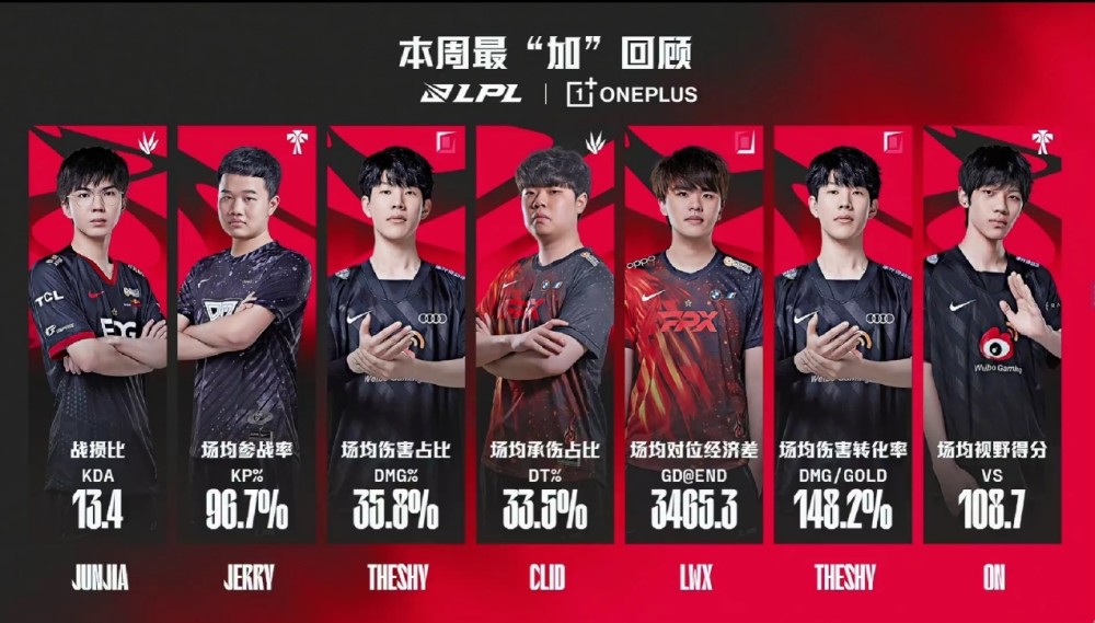然后因为今天是周日,结束之后官方有一个最加数据评选的一个图,在这个数据中,The Shy的场均伤害占比和伤害转化率都是排名第一,On的视野得分也有上榜。