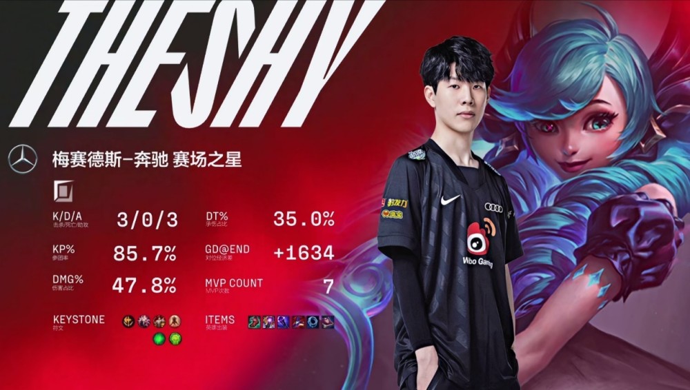 结果这一局The Shy果然是一个无敌的个人表现,直接最强三件套神话装的一个峡谷制造者加上法穿棒加上一个大帽子,在比赛过程中The Shy以一人之力将对方四人打退并且还击杀了一个。