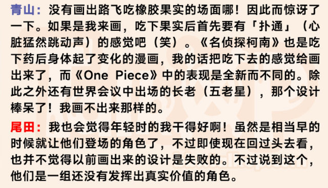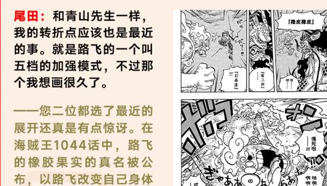 随后青山就跟尾田说,路飞五档的形态,我很喜欢好厉害啊,很棒啊,很出众的设计,居然能画出这种脸,您是怎么想到的呢。而尾田则说,谢谢。就请想成我突然开始画“猫和老鼠”了吧。其实换句话来说就是路飞的五档灵感来源就是猫和老鼠,所以路飞一直笑,他的战斗力就越强。而且尾田还说,自己是杰瑞派,说白了尾田就是要增添一些搞笑以及幽默的成分进去。