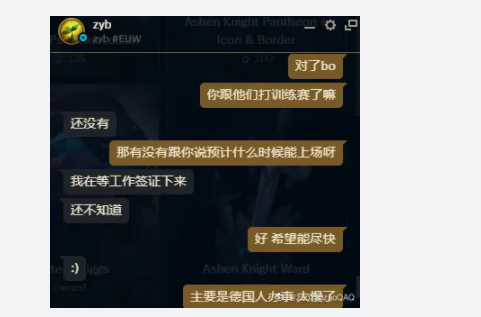 所以这也是很多欧洲粉丝,想要看到Bo登场的原因,同时很多LPL的粉丝也很期待,毕竟他已经离开了LPL,也倒是很想看看这位“中援”,可以在其他赛区里面,打出什么样的发挥。但Bo现在并不能够登场比赛。有些网友在欧服当中遇到了Bo,并且向其询问了一些情况,原来Bo当前并没有拿到工作签,所以还无法前往德国的主场。
