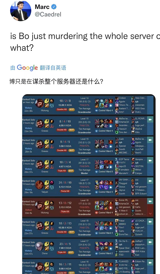 LEC的解说Marc在近期就十分关注Bo的rank,当他看到Bo近期的战绩之后,也是感到相当的不可思议,因为Bo在这一页战绩当中,几乎是保持权证的,而且每一场游戏的数据都很离谱,MVP更是一个接一个,仿佛就是来进货的一样。同时他也配文:“Bo这是来统治欧服还是要干什么”?任谁看到了这样的一页战绩,都会觉得非常的可怕。
