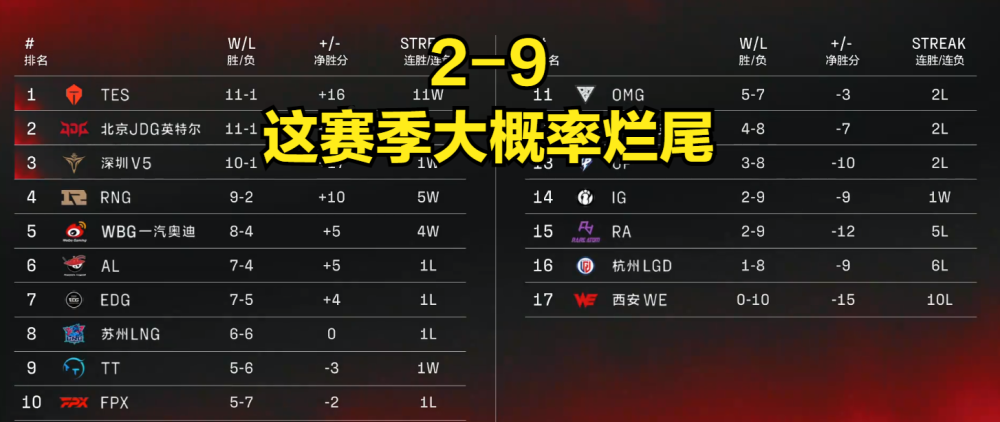 北京时间7月25号,在RA和RNG的常规赛BO3中,RA以0:2不敌RNG,吞下五连败。目前RA的最新战绩是2-9,就算接下来5个BO3全胜,最好战绩也不外乎是7-9,已经很难进季后赛了。而且RA后续的比赛,要面对劲敌EDG和LNG,还要遭遇目前势头正旺的TT战队,比较稳的只有IG和LGD这两分,后续赛程对RA来说很难。