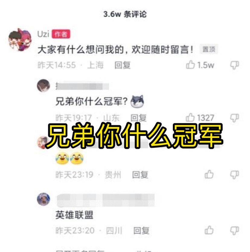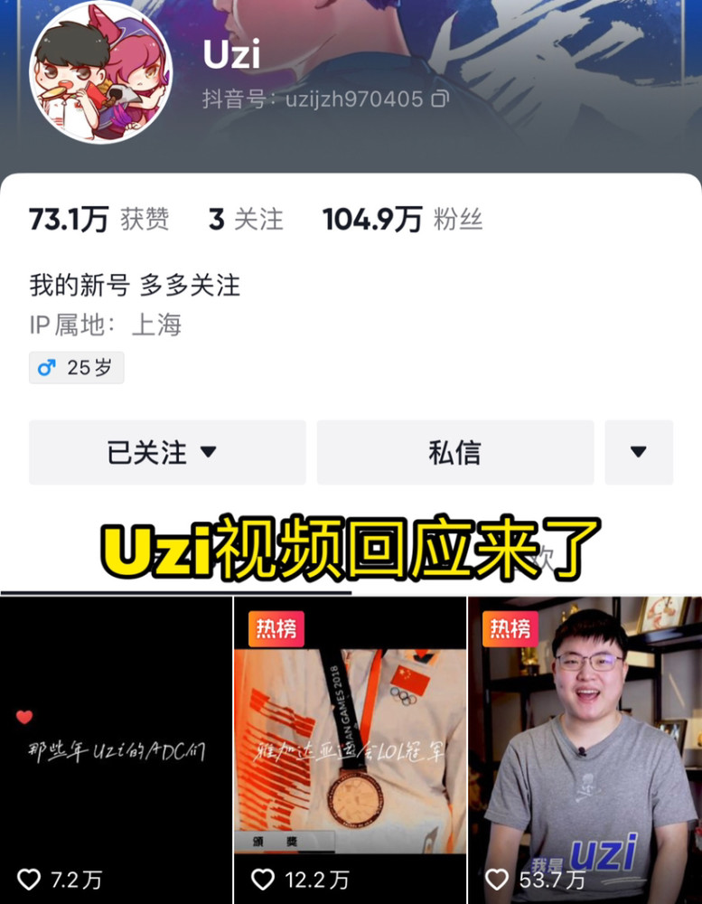 由于Uzi的商务合同都转到了B站旗下,但之前Uzi拥有近600W粉丝的抖音账号在pdd手里,因其本人以及经纪公司要求封禁,于是老账号就注销了,后续Uzi也于重新开设抖音账号,同时在账号上发布了短视频内容,并在评论区中邀请网友提问留言,然后对于网友提问:“兄弟,你什么冠军?”的问题,Uzi本人也在第二条视频中有封面进行了回答:那就是雅加达亚运会冠军!