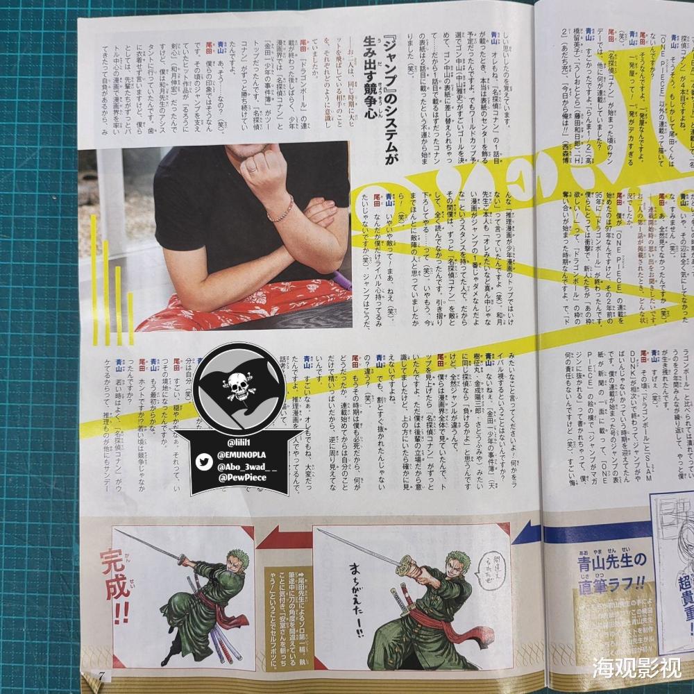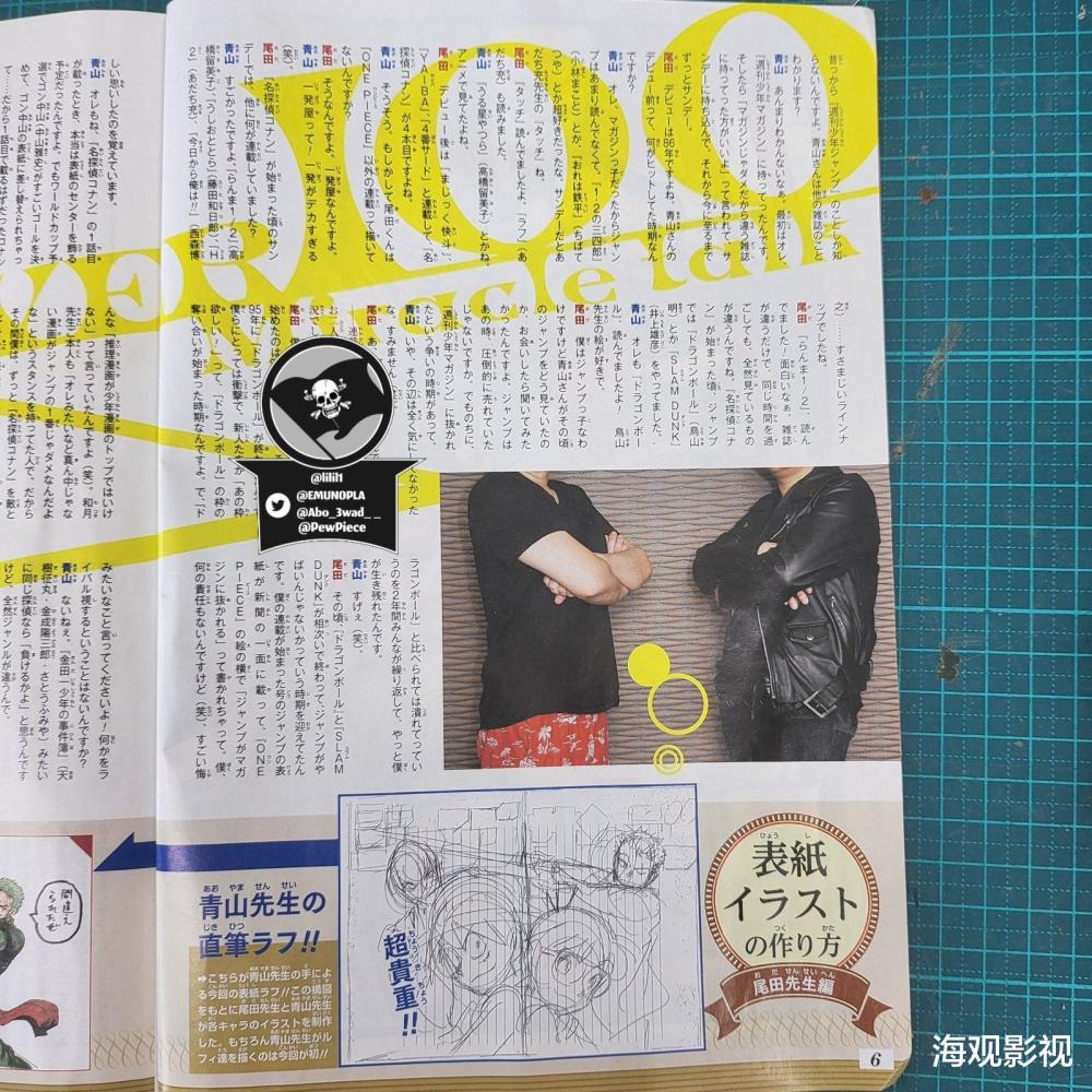 •值此特殊时刻,另一家出版社的扛鼎之作、同样是连载漫长的《名侦探柯南》作者青山刚昌与尾田荣一郎的梦幻对谈的前篇也同时刊载在最新一期《周刊少年JUMP》上,同时,《海贼王》衍生漫画《食戟的山治》也将迎来最终话。