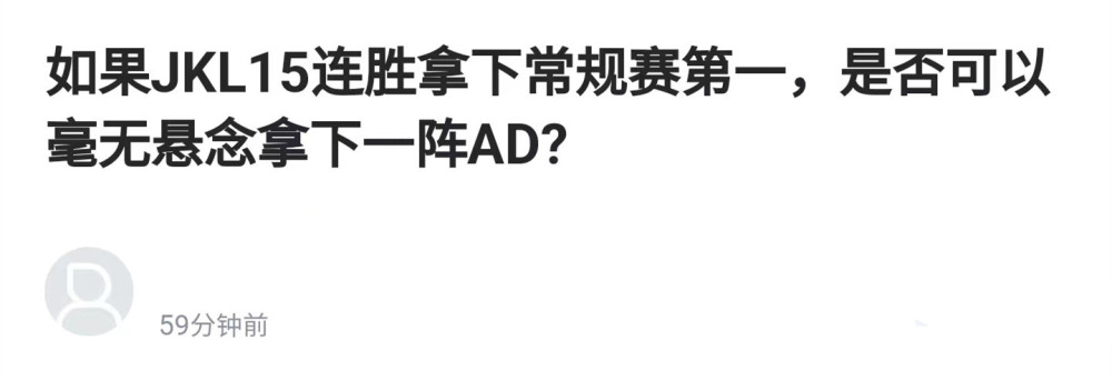 一切的准备都将为了最高荣誉,所以当有粉丝提问如果JKL以15连胜拿下常规赛第一,是否可以毫无悬念拿下一阵AD的荣誉呢?对于这个问题,国服第一奇亚娜北枫表示没什么意义,还不如冠军更实在一些。