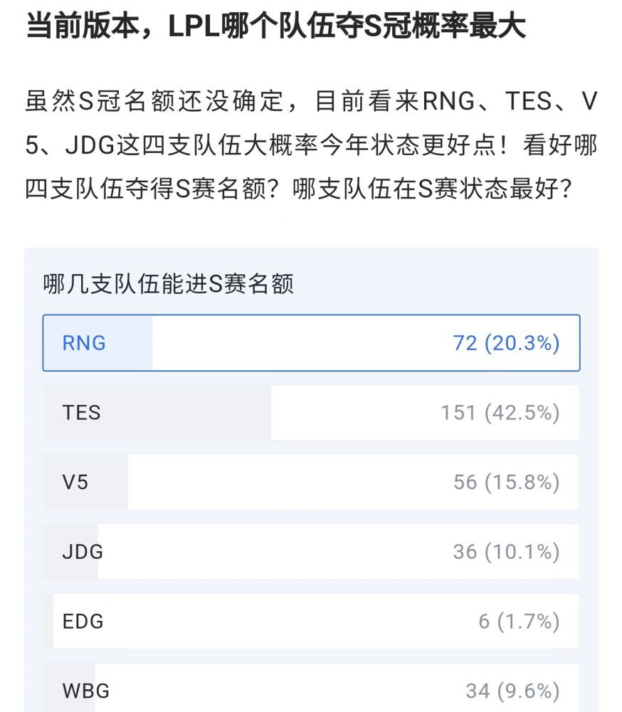 那么参考当前版本,这6支队伍在世界赛夺冠的概率有多大呢?网友们对此进行了投票,最终发现支持TES的有很多人,RNG在投票中排名第二,V5、JDG和WBG的票数也都不低。唯独EDG的支持率很低,这应该与他们在夏季赛的发挥有很大关系。所以北枫认为从这方面可以看出来,EDG基本上无缘今年的世界赛,因为WBG票数最少因此进入世界赛的概率也是不高的。综合来看,代表LPL参加世界赛的队伍应该是RNG、TES、V5、JDG,不知道大家认可北枫的看法吗?