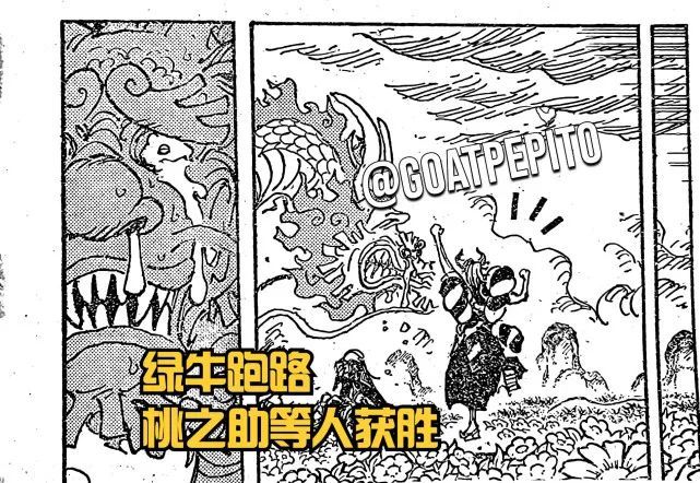 第三张情报图是桃之助仰卧起坐,在给尾田大神发了红包后获得新的外挂,于是才有了分镜下的一幕,蛟龙形态的桃之助成功施展凯多的【热息】,这一招的威力还是很惊人的,直接将巨大化的绿牛一顿猛烧,十分凄惨。