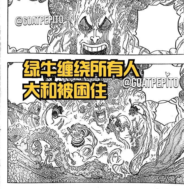 第二张情报图展示了绿牛的森森果实能力,此时的他动起了真格,不想跟这群武士以及凯多女儿在这浪费时间,所以释放森森果实能力困住小忍、河松、传次郎、猫蝮蛇、犬岚以及大和,没有雷藏,而桃之助则是倒在地上一动不动,不知道是不是领盒饭了。