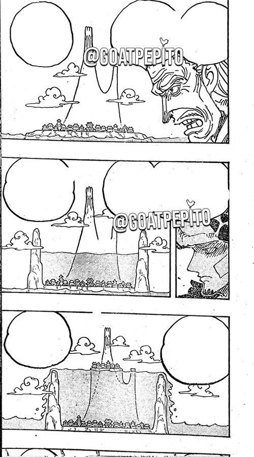 和之国历史这边,寿喜烧带罗宾和罗深入地下,见到了古代和之国的遗迹。在八百年前,古代和之国的面积比现在大得多,但不知为何建起了一圈石头壁垒,导致内部被水淹没。最后只剩下山顶的一小块地露出水面,这块地就是现在的和之国。而那圈壁垒,就成了现在的大瀑布。