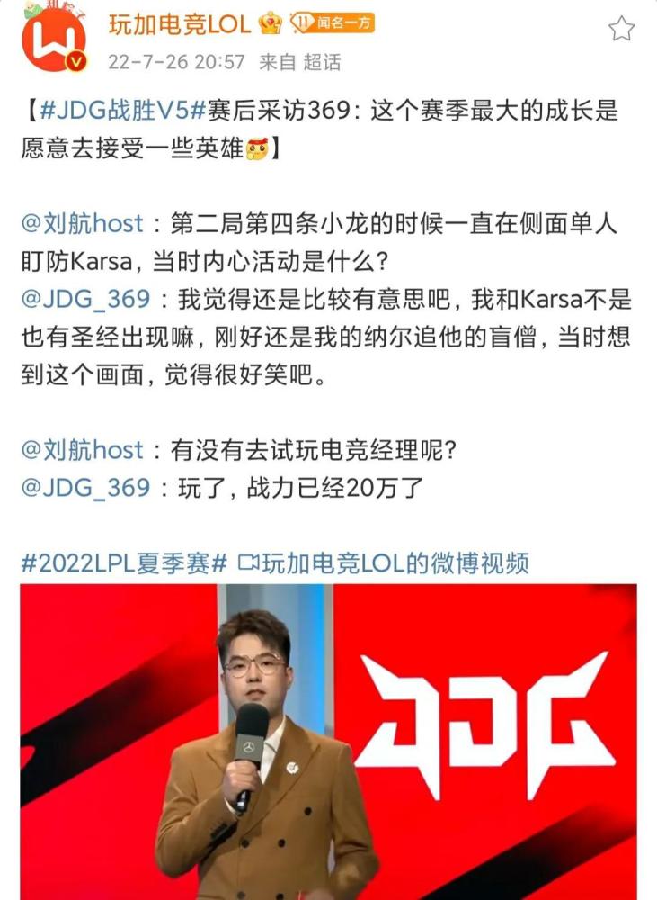 前言:S12赛季的比赛已经正式开始了,相信绝大多数的玩家都关注了最近一段时间的夏季赛,lpl赛区的对抗是非常激烈的。排名靠前的几支战队都已经确定了季后赛的名额,现在他们唯一要争夺的应该就是前二的排名,毕竟在常规赛拿到前两名之后会获得季后赛的复活甲,大概率提升夺冠。就在最近,jd g战队和V5战队的比赛成为了很多玩家关注的焦点,作为目前来看的常规赛前两名,大家都觉得这两支战队会进行的非常精彩,没想到jd g战队竟然横扫了V5战队,上单369的纳尔也打出了很精彩的操作,赛后采访更是回应了之前卡萨的质疑。