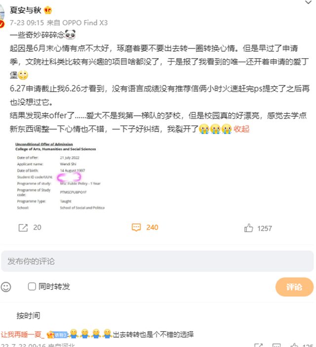 六月份夏安说自己没通过LPL考试,无法成为主持人。六月末她心情不好,想出门转转。于是,夏安申请了一所新的大学,当时申请时间已经快要结束,夏安就做了两个小时提交了申请,然后再也没想过。七月底,夏安突然发现这所学校给自己发了offer。她有些纠结,这所学校不是她想选择的,但是校园很漂亮,去学新东西也很不错,夏安开始考虑何去何从。