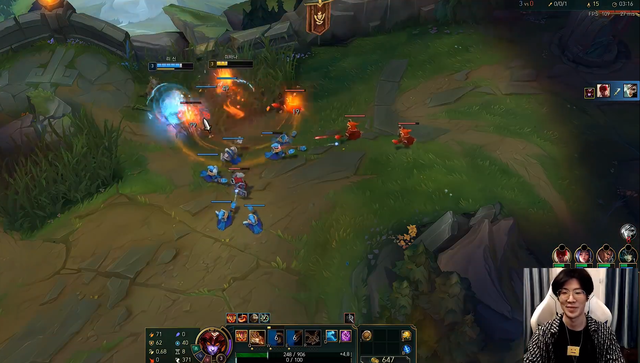 这局游戏,Theshy上路对阵锐雯,前期双方就一直消耗互拼。有趣的是,这局打野是EDG打野Jiejie,3级Jiejie来到上路,Theshy卖了个破绽,锐雯直接无脑对拼,Jiejie盲僧拿到人头。Theshy看到Jiejie这么快就来上路帮忙,直接笑开了花,并且表示“这就是EDG吗,EDG厉害”。