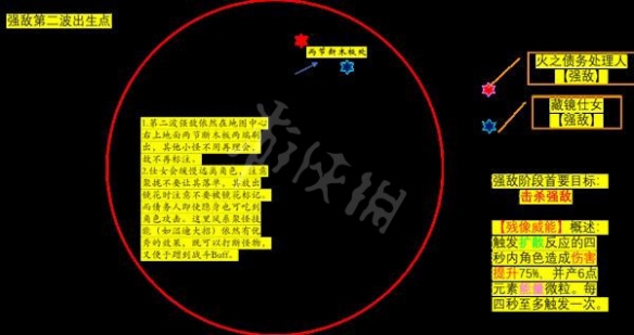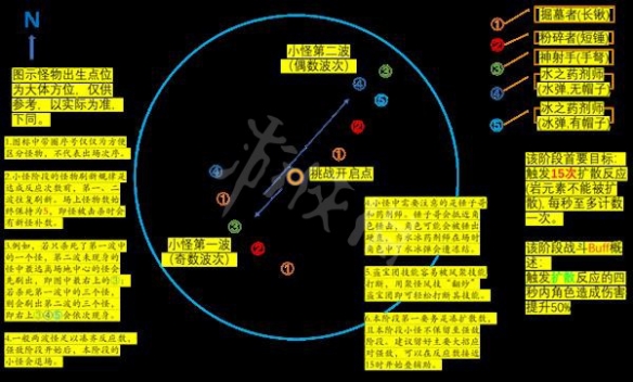 今天我们继续分析挑战中的走位要点,具体技能释放操作因队伍而异,此不详述。走位打法上,楼主观察游戏内挑战的怪物规律后,制作了绝路挑战的大致的怪物刷新点位图,操作说明已附在图中。(若图片字小不清,可点击图片后缩放阅读。实在不能看清的,可在评论区留言,楼主将会在评论区誊写复述。)