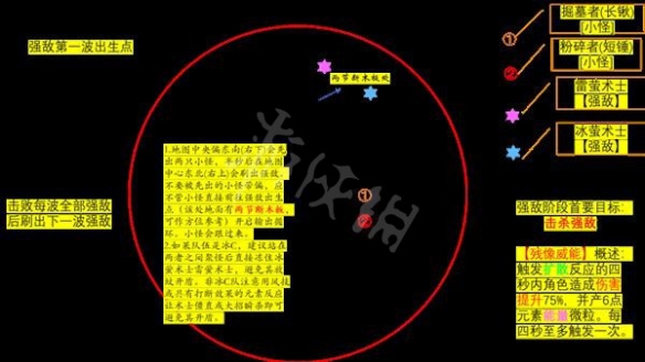 小怪为盗宝团阵营,为便于旅行者辨识怪物,图例括号中注解了怪物的武器或特征。【残像威能】激发前,场上小怪始终为5个,第一、二波往复刷新。详见图A。小怪阶段以凑反应数为第一要务,注意不要被锤硬直或冻结。图中蓝色箭线为大体走位轨迹,在箭头位置即可着手扩散。