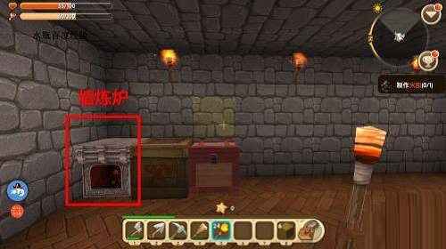 1、首先在屋内做一个熔炼炉。通过消耗燃料的技巧将精铁矿转为精铁锭,熔炼炉是必不可少的。先合成木板激活工具台,将工具台放在地面上右击,利用泥土和岩石块合成熔炼炉。