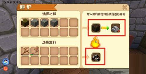 5、右击熔炼炉。将挖到的精铁矿放进去,选择燃料,几十秒后精铁矿就煅烧达成了。