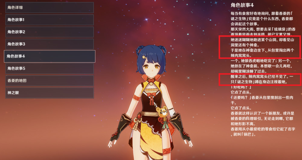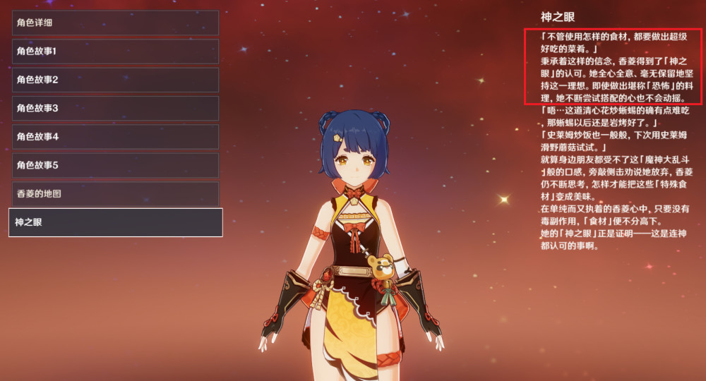 而培养过香菱的玩家,对于这个角色可能都有过这样的困惑,她的神之眼是什么时候获得的?锅巴是否和安柏的兔兔伯爵一样?神之眼和锅巴又有没有关系?因为这些信息,在香菱好感度10级的情况下,也依旧是没有解释清楚。在关于香菱获得“神之眼”的介绍中,显得十分让人迷惑,就因为她有一颗不管用什么食材,也要坚持做出超级好吃的菜肴的心,火神就认可她了?难道,火神也是个老饕?