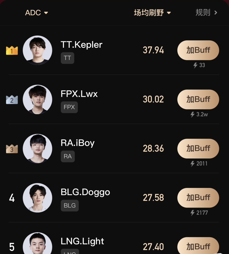 本以为这已经很离谱了,没想到LNG下路Light选手的刷野数据也非常高,Light单场的平均刷野数量是27.4,排名所有ADC的第五位。