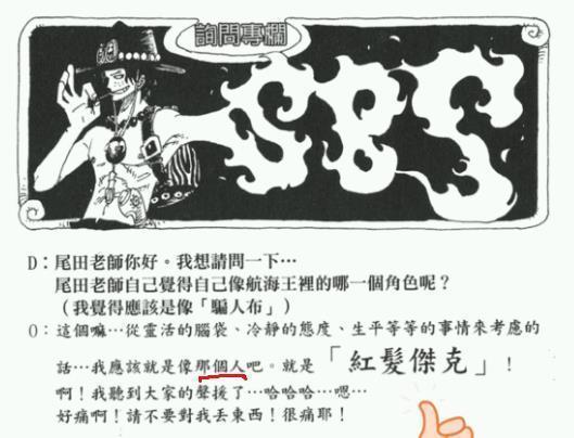 我们再来看看另一个SBS问题,是网友提问【谁最像尾田】。对于这个问题,作者尾田大神想了想,觉得【香克斯】就是他自己,同时也采用了【那个人】来进行暗示。