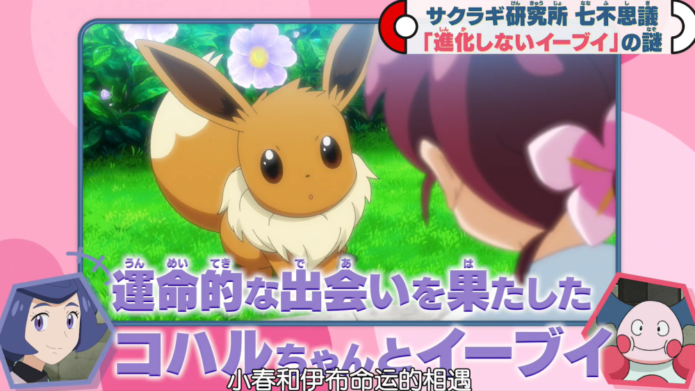 小春和伊布是在学校花坛里初次相遇的,还在考试的小春被来电汪叫去认识新朋友,双方虽是初次见面,但有一种莫名的亲切感,博士助手称这是一见钟情,在经历了一些误会后这集结尾小春还是把伊布还给研究员,但是伊布有了自己的选择,它想和小春在一起,研究员于是将伊布送给小春,她认为伊布和小春在一起或许能解开不进化之谜。