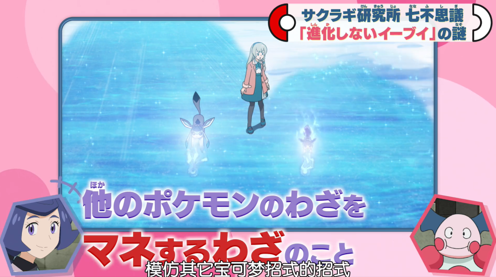 然后说到这只伊布除了不能进化之外还有一个特点,那就是喜欢模仿其他宝可梦的动作和招式,它模仿过来电汪的电光,水伊布的水炮,叶伊布的飞叶快刀等等,博士助手提出了这和伊布不进化是否有联系的疑问,我看未必,这些复制技能的能力不就是另一个招式仿效的效果吗。