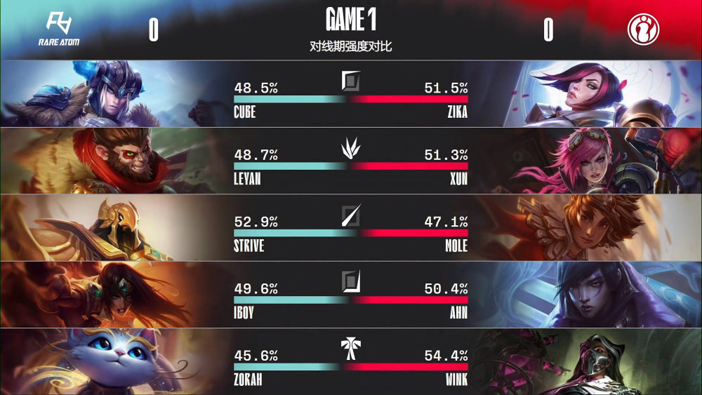 第一局比赛,RA蓝色方,禁用德莱文,纳尔,破败之王,阿狸,格温,选用Cube猪妹、Leyan猴子、Strive沙皇、iBoy希维尔、Zorah猫咪;iG红色方,禁用滑板鞋,泽丽,波比,塞拉斯,武器大师,选用Zika剑姬、Xun蔚、Mole岩雀、Ahn厄斐琉斯、Wink烈娜塔。