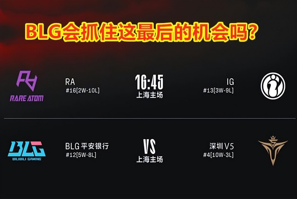 其中RA和iG由于都已经能失去了季后赛机会,因此他们之间的比赛,完全可以看成是一场公开训练赛!真正有看点的,还是BLG对阵V5的比赛,BLG如果能击败V5的话,则保留一丝季后赛希望;V5如果能赢下比赛的话,也在理论上保留争夺复活甲的机会。