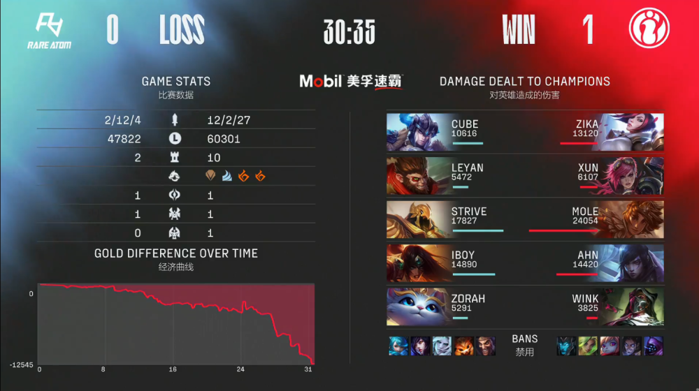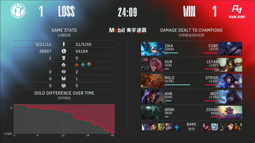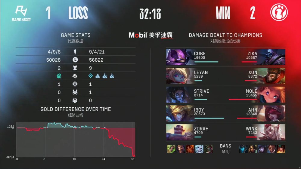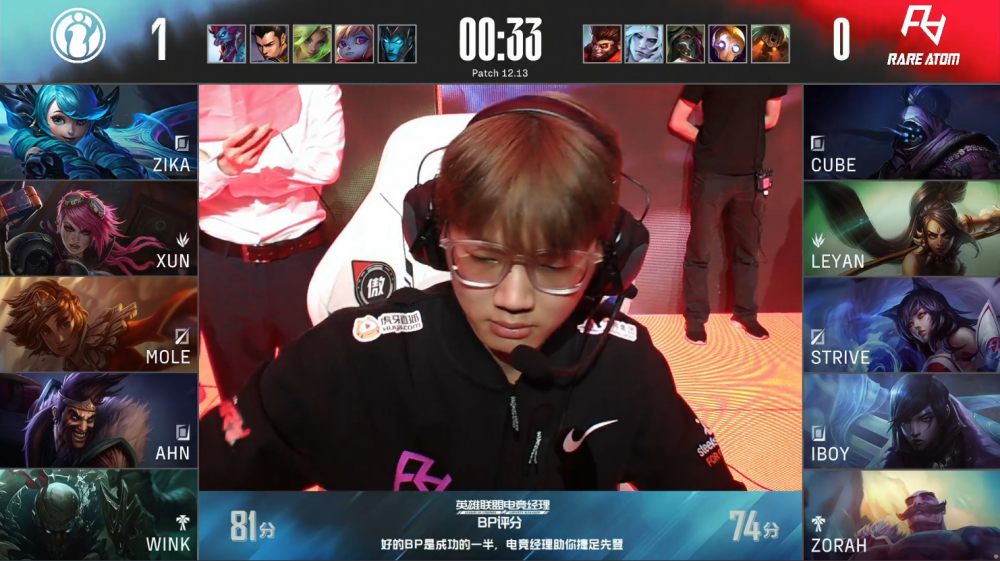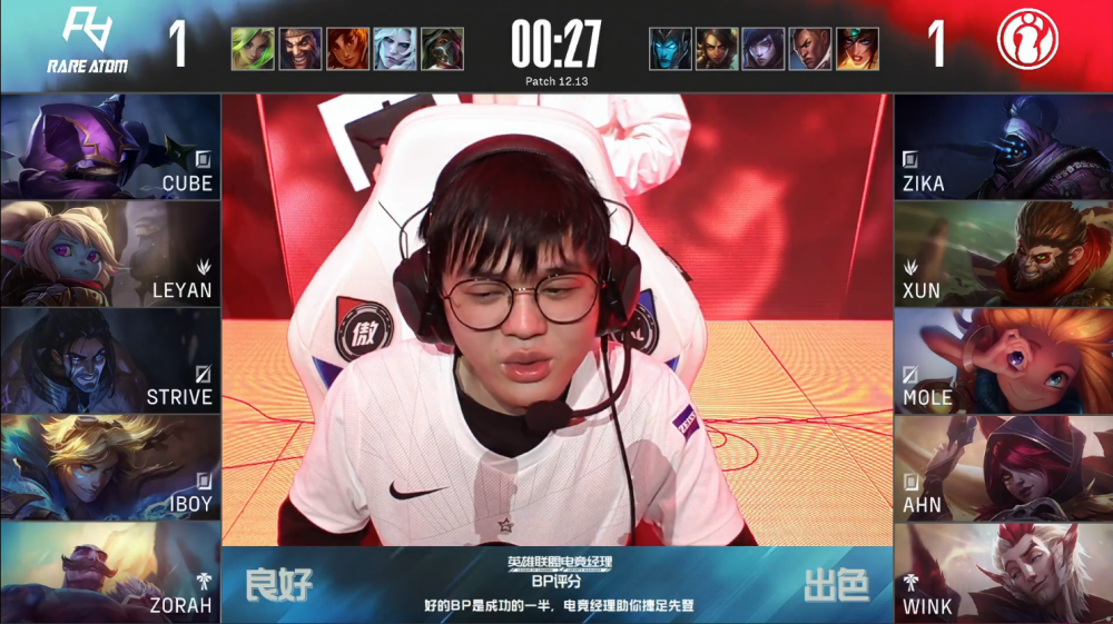 决胜局,RA蓝色方,禁用烈娜塔,破败之王,岩雀,德莱文,泽丽,选用Cube凯南、Leyan波比、Strive塞拉斯、iBoy伊泽瑞尔、Zorah布隆;iG红色方,禁用滑板鞋,豹女,厄斐琉斯,卢锡安,希维尔,选用Zika武器大师、Xun猴子、Mole佐伊、Ahn霞、Wink洛。