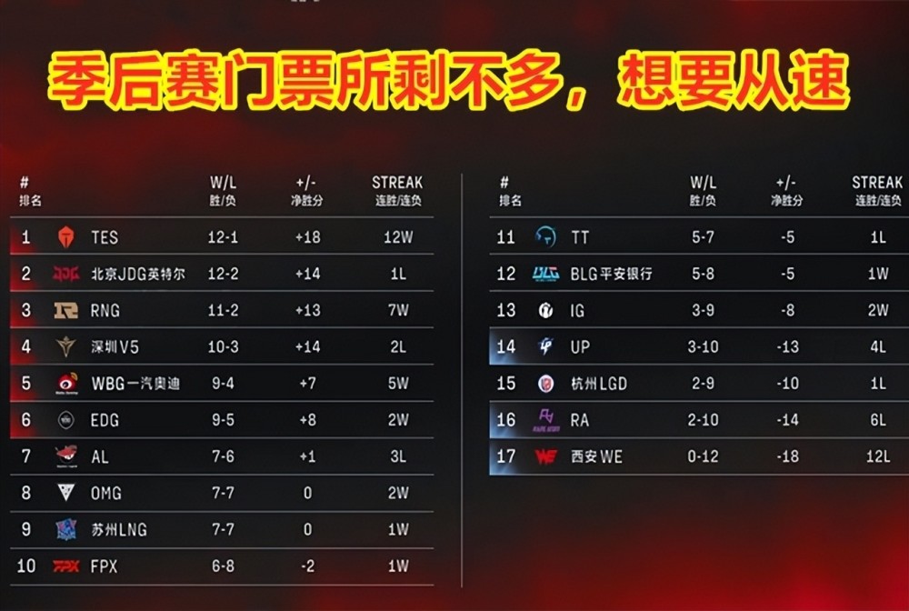 英雄联盟S12赛季,LPL夏季赛常规赛进入了最后的收官阶段,季后赛门票还剩4张。而有机会拿到这四张门票的队伍,却还有6支之多。