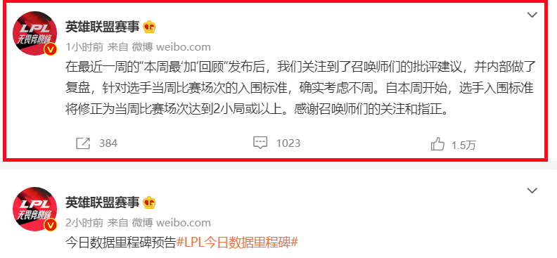 北京时间8月2号傍晚时分,LPL官博发文,就此前被闹得沸沸扬扬的“JKL各项数据第一,数据却故意造假”事件正式道歉。官博的原文如下:“在最近一周的“本周最‘加’回顾”发布后,我们关注到了召唤师们的批评建议,并内部做了复盘,针对选手当周比赛场次的入围标准,确实考虑不周。自本周开始,选手入围标准将修正为当周比赛场次达到2小局或以上。感谢召唤师们的关注和指正。”
