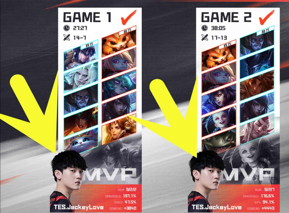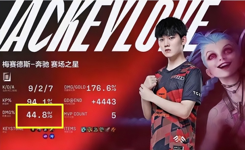 简单回顾一下这次“数据造假”事件。7月31号,LPL官方在周日晚上公布每周数据最佳选手的名单。其中获得最佳场均伤害占比选手是LGD下路:Assum。但是,在当时,TES下路选手JKL,拿了两盘MVP的数据都很豪华。JKL用轮子妈拿到MVP,伤害占比高达47.5%;JKL用金克丝拿到MVP,伤害占比高达44.8%。47.5%+44.8%再除以2,得到一个场均伤害占比的均值,应该是46.15%。