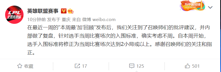 LPL官方具体的回应如下,表示已经收到了大家的批评和建议,并且官方内部也对数据做了复盘,确实是有很多考虑不周的地方,所以决定从本周开始,修改选手入围的标准,本周比赛场次达到2小局或者以上才有入选的资格。