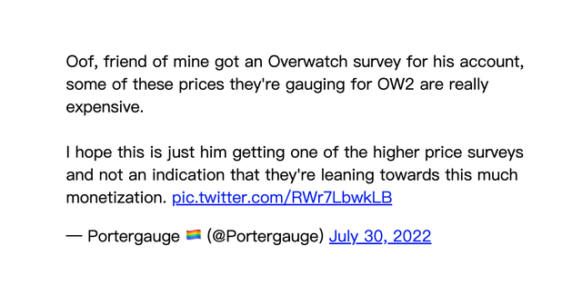 “这项调查完全是为了更好地了解玩家对不同类型的守望先锋 2的偏好,”守望先锋发言人通过电子邮件告诉Kotaku 。“调查中显示的价格是每个用户随机显示的,并不代表最终定价。我们计划在 10 月 4 日发布之前分享我们的商店和战斗通行证系统的详细信息。”