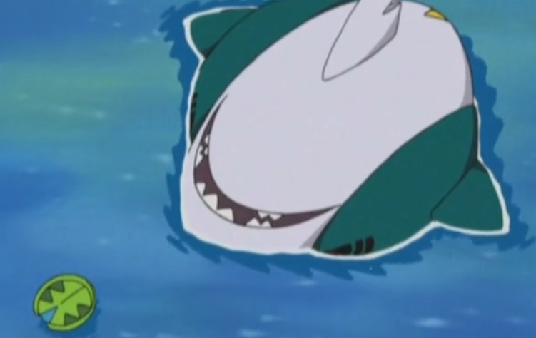 被巨牙鲨袭击的小智一行人只能临时在岛上靠岸避免在海中被袭击,晚上的时候火箭队三人组也被巨牙鲨群给包围,这个时候武藏的饭匙蛇用毒尾打中了首领的巨牙鲨,隔天小智一行人采用了引诱大群巨牙鲨,然后单独和巨牙鲨首领对战的方式来应对巨牙鲨群,但是因为昨天被饭匙蛇毒尾击中缘故,让首领的巨牙鲨处于带毒状态,被小刚的莲叶童子一招水枪就给打败了,这时候小智一行人才发现巨牙鲨中毒,并且反过来照顾起了巨牙鲨。