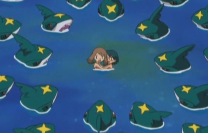 在这一集中,小智一行人还在哈奇老人的船上,且在前往武斗岛的路程中,小智一心想前往武斗岛进行道馆挑战,而在小胜的拍马屁下(说小智是高手之类的),小智终于同意在附近的岛屿玩一下再走,于是一行人来到了一个半月形状的岛屿,据哈奇老人的说法是他以前经常来到这座岛屿休闲,但是,小遥和小胜刚下水游玩不久,就被一大群的巨牙鲨包围,,嗯,想一下巨牙鲨的原型是鲨鱼,那么设想现实中被一群鲨鱼包围是种什么样的体验,,
