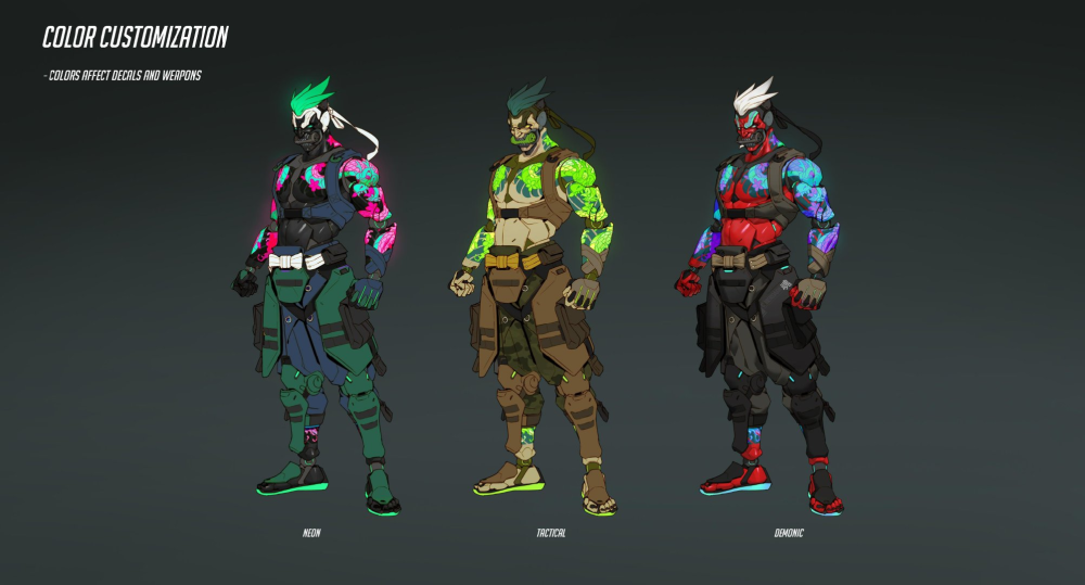 从官方已经曝光的图来看,目前传说皮肤可以改造的部分有面部造型、纹身样式还有整体配色。