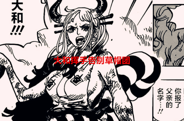 此外,桃之助和锦卫门打完绿牛之后,就睡了一觉,他们醒来后才发现一个问题,草帽团一伙人要离开了,应该起来欢送他们,可路飞他们早就跟和之国的人告别了,是路飞不想打扰桃之助和锦卫门等人,所以自己就离开和之国了,他们已经上船了,并且开走了,而此时大和站在城堡的屋顶,准备跑向路飞一行人那边,这其实说明了一个道理,大和要挥手告别草帽团了,她没办法上船了。就像薇薇公主跟草帽团离别的场景相似吧。