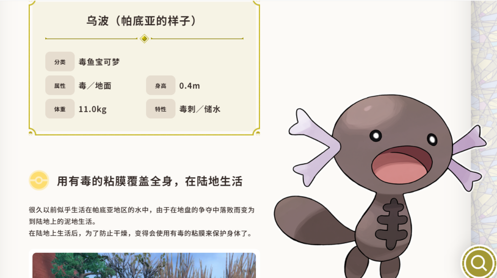 由于长期在陆地生活,乌波的腮已变得很坚硬。尽管身体笨重,行动迟缓,它还是能从腮释放出毒液来保护自己。在乌波生活的地方,似乎有时能看到中毒的宝可梦。