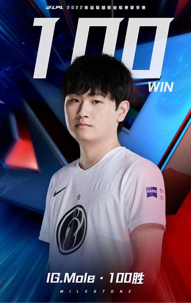 在今天RA对阵IG的第一局比赛中,IG中单Mole达成了LPL 100胜场里程碑。