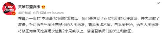 而在今天,LPL官方承认入围标准中的当周比赛场次考虑不周,因此今后改为当周参赛2小局或以上即可入围。