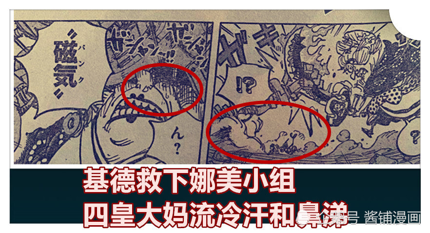 娜美,乌索普,阿玉惊慌失措,拿破仑的刀刃却被机械巨手握住,原来是超新星基德出现,当另一只巨大的机械手出现,犹如泰山压顶一般,摁在四皇大妈脑袋上的时候,四皇大妈流了冷汗和鼻涕,这个基德的操作,着实吓了她一跳,让四皇大妈很失态。